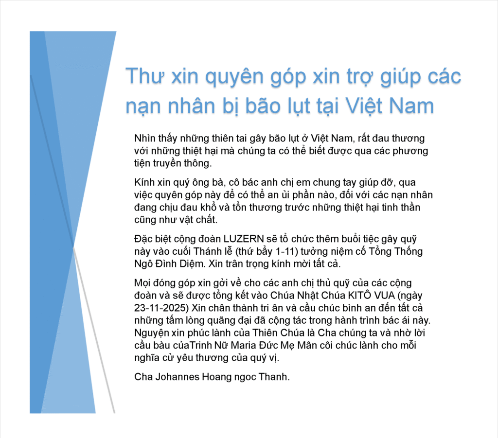 Cộng Đoàn Công Giáo Luzern trân trọng kính mời quý đồng hương cùng đến tham dự Đêm Nhạc Karaoke Gây Quỹ, cùng nhau hát, chia sẻ và ủng hộ các nạn nhân bão lụt tại Việt Nam.